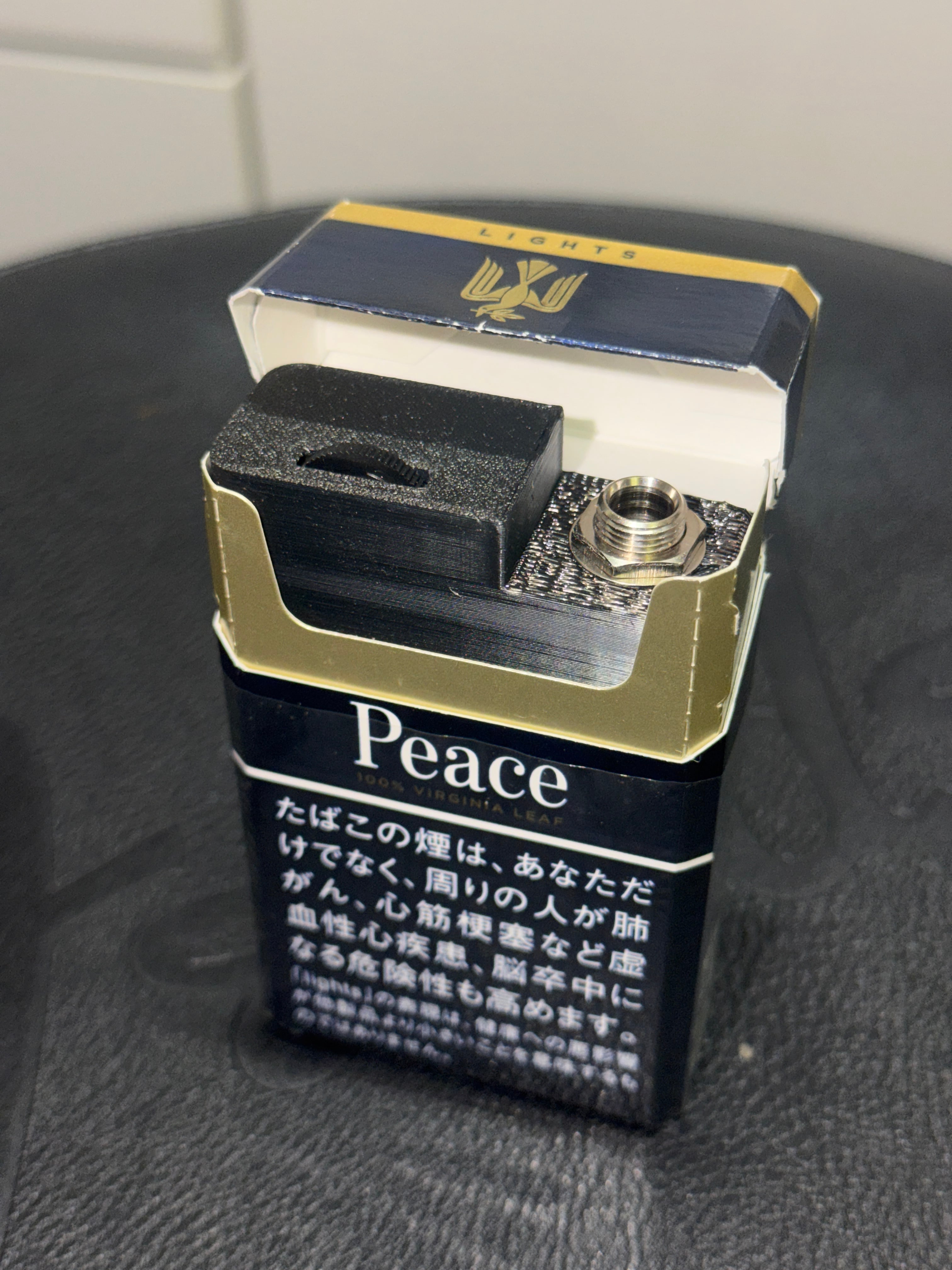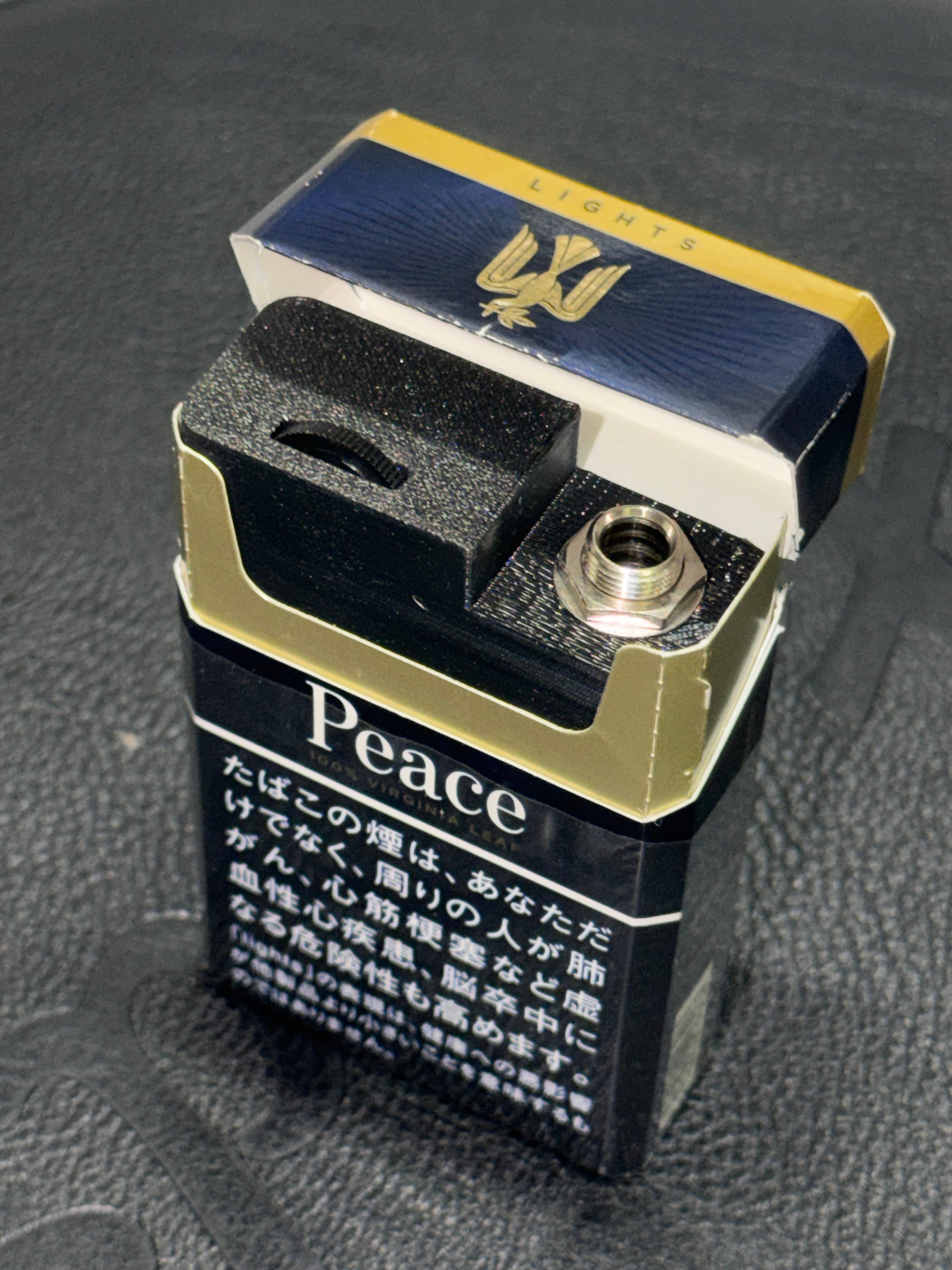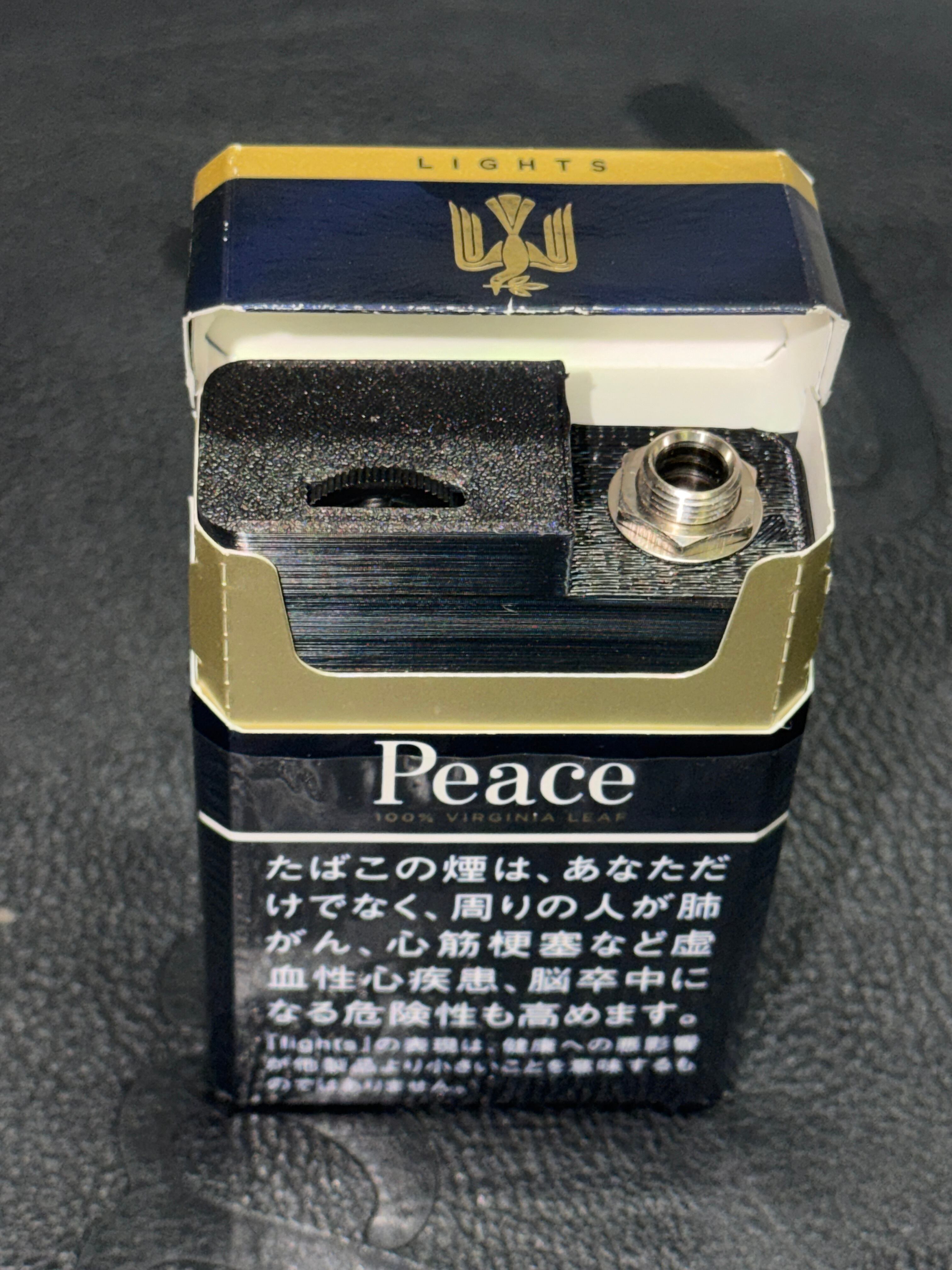 Peace Liteを基準に製作していますが、お手持ちのタバコ箱に入るかどうかはサイズをご確認ください。ケースは3Dプリンター製作。